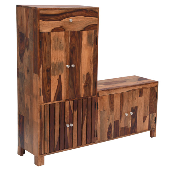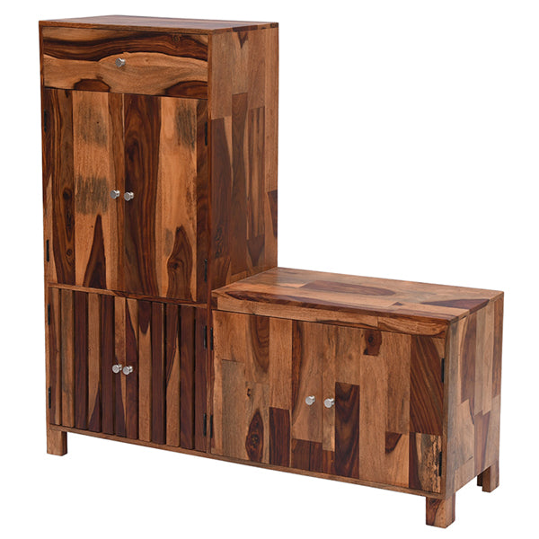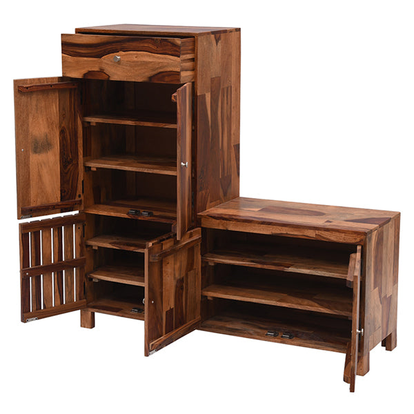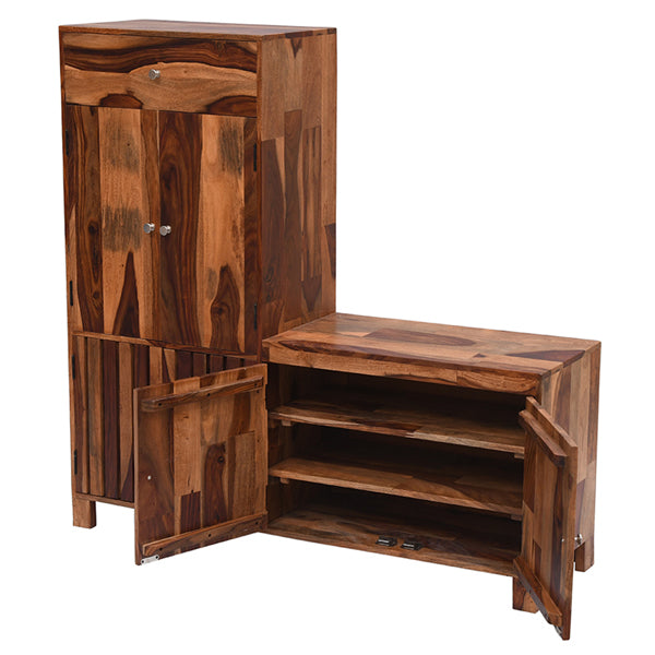 Every piece of furniture counts when it comes to the interior decor of your place. From your Dressing table, or a side table, to your shoe cabinet, everything elevates the beauty of your house. Thus, one should make sure that they are choosing nothing but the best furniture to bring out the beauty of the place. The L shaped shoe racks online range is furnished from best quality Sheesham wood. The L shaped shoe racks online come with 2 storage options; Drawer and Shutter Storage, allowing this shoe rack to look more beautiful and store in large quantities too. Our L shaped Shoe Racks is minimalist in nature but sturdy and functional in every sense and it also gives a facelift to the space that has been empty for a while now. The best feature about the design of this shoe storage is its Natural Finish making it looking subtle and stylish.