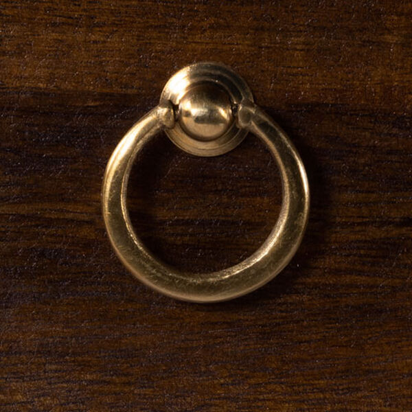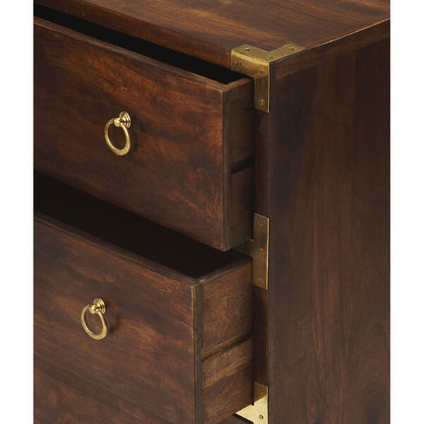 This three-drawer amber chest is a versatile addition with virtually any décor. Featuring a dark walnut wood finish with antique brass ring pulls and corner brackets, it is crafted from mango wood solids and wood products.