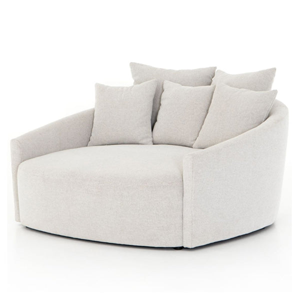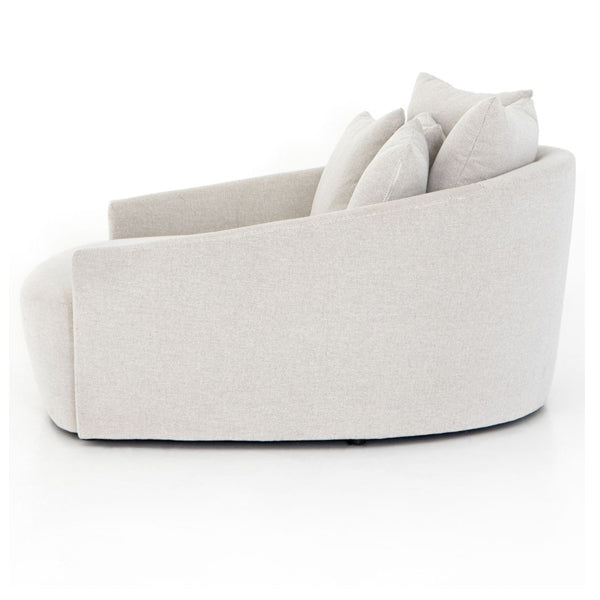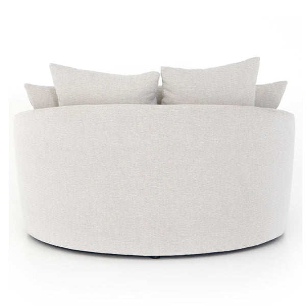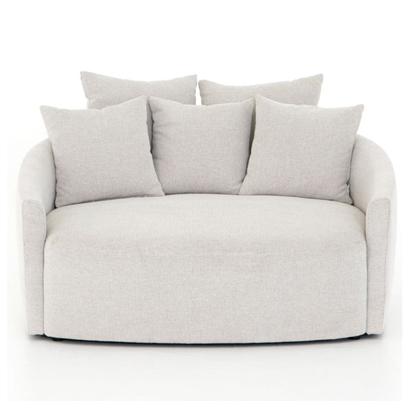 Light grey performance-grade upholstery forms a dramatic U shape for a spacious, sink-in sit. Throw pillows present an added touch of comfort to this sensibly styled media lounger, perfect for movie nights.