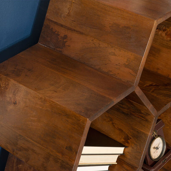 Add a touch of Mid-Century Modern style to your home with our OKIA geometric shaped Bookcase. The sleek lined design is finished in a rich, warm brown. Five shelves provide ample storage and display space. Perfect for an office or living space.