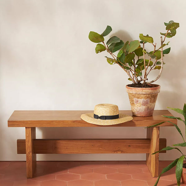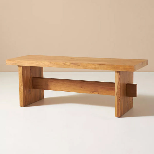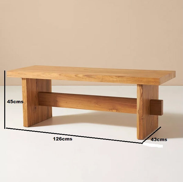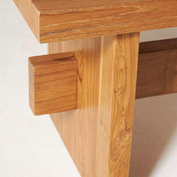 Crafted from teak wood and attentively finished by hand, this bench invites nature’s palette and texture into your home. A vertical leg bar emphasises the crisp lines of its squared top, which together showcase the coarse grain of natural teak wood.